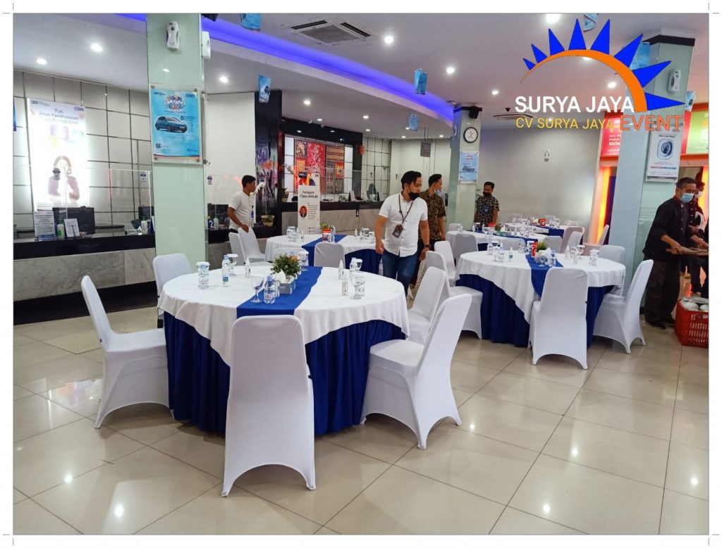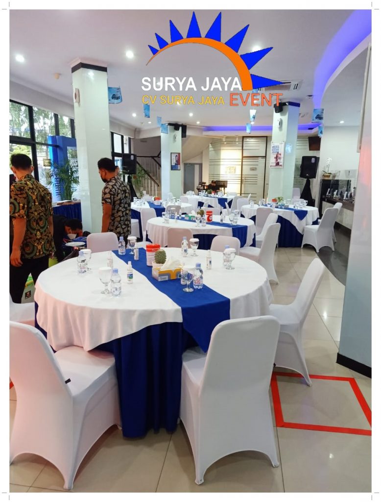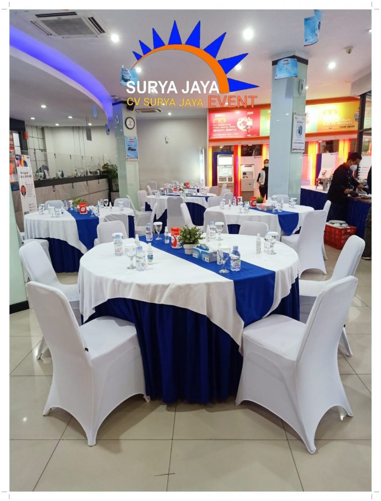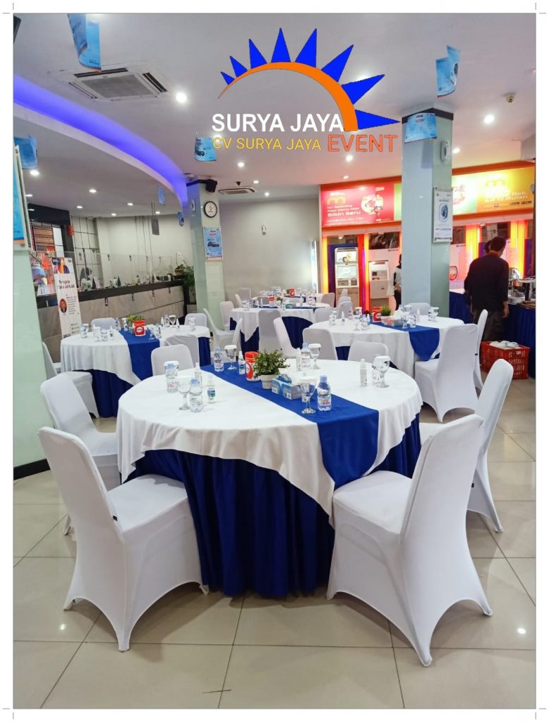 CV.Surya Jaya Event kami Sewa Meja Dan Kursi Untuk Acara Berkelas Di JABODETABEK.Meja dan kursi yang kami sewakan adalah Meja bulat cover meja biru kombinasi topping putih dengan runner meja biru dan kursi futura cover ketat putih.Untuk warna cover meja kursi,topping dan runner meja tersedia bermacam pilihan jadi anda bebas pilih sendiri sesuai selera atau bisa sesuai tema acara.