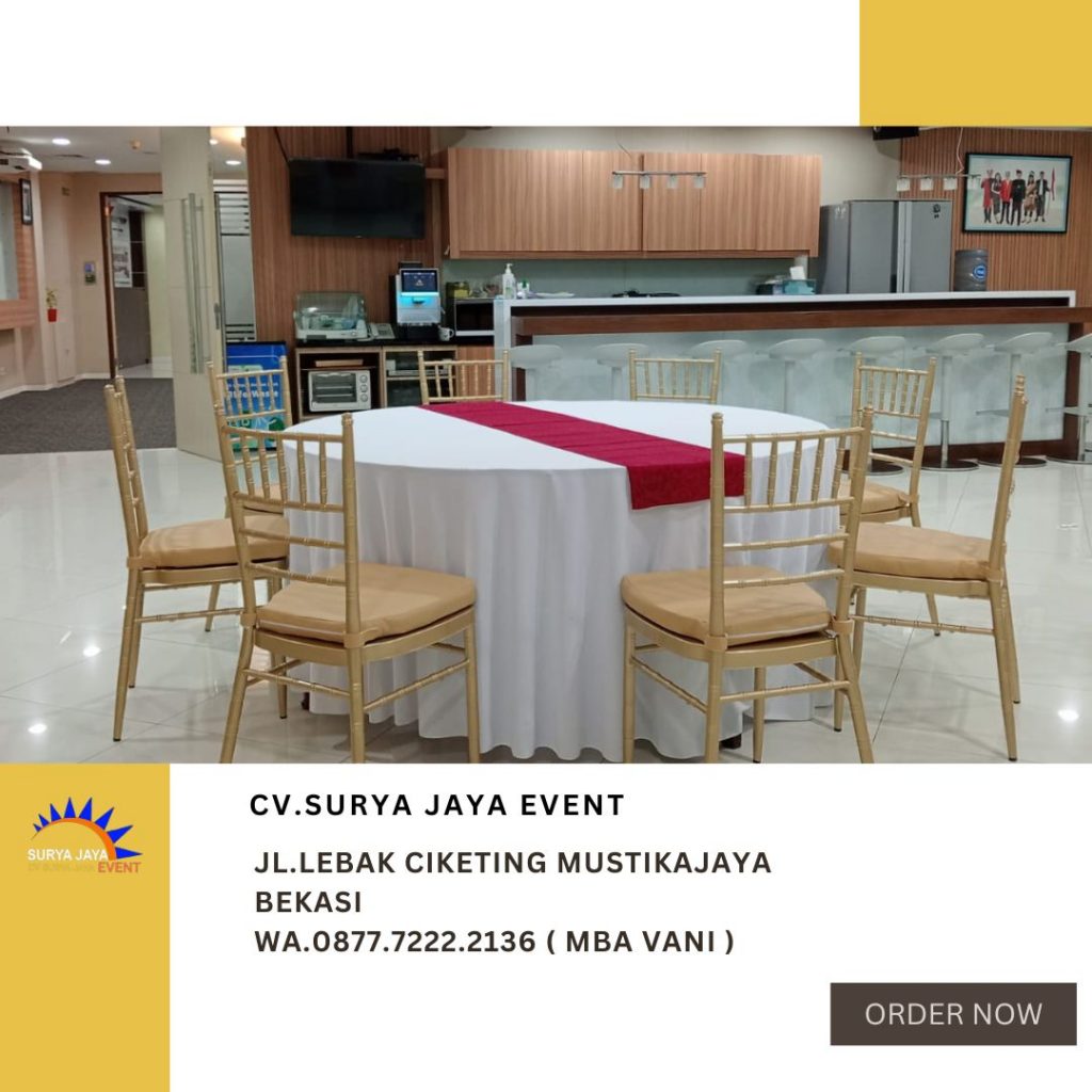 Ayo sewa kursi tiffany dan meja bundar di CV SURYA JAYA EVENT kami saja yang harganya terjangkau dan kualitasnya bagus. Untuk pemesanan anda boleh telpon atau WA ke 087772222136 ( vani ). Admin kami akan melayani anda dengan respon cepat dan memberikan layanan terbaik untuk acara anda.