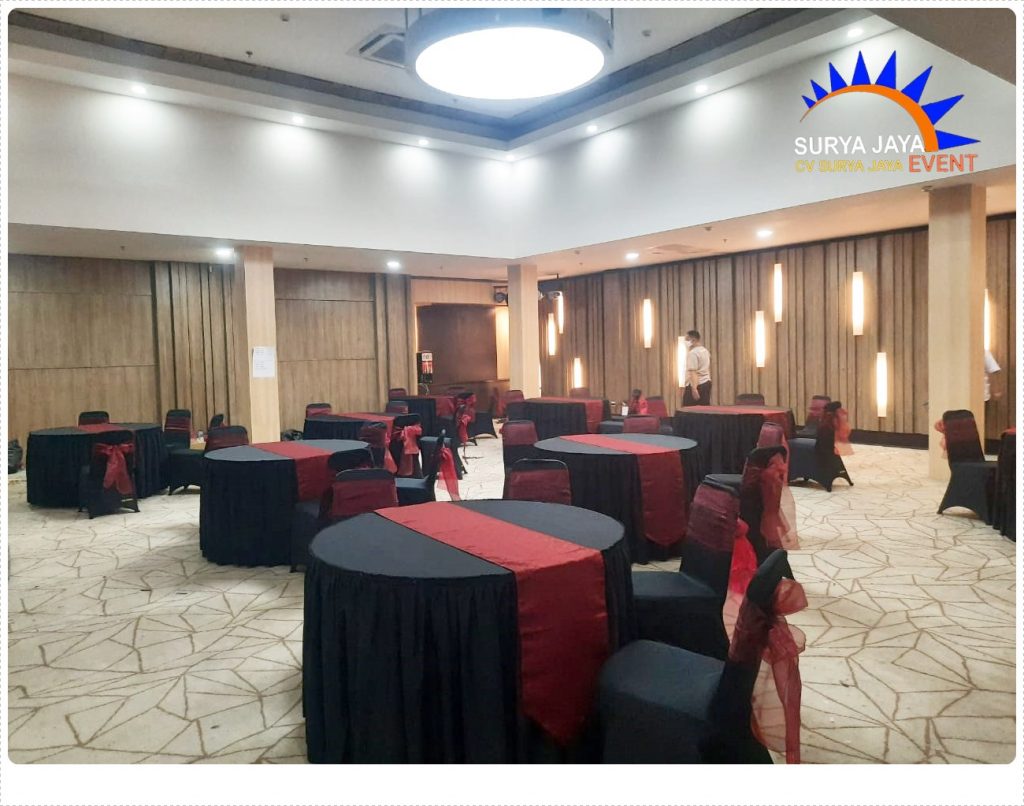 Meja bulat bercover taplak meja putih dan berrunner gold.Untuk kebutuhan kursi anda juga bisa sewa kursi punya CV.Surya Jaya Event.Untuk kursi CV.Surya Jaya Event tersedia bermacam jenis pilihan seperti kursi futura,kursi raja,kursi dinner,kursi tiffany,kursi olivia dll.
