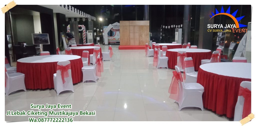 CV Surya Jaya Event kami menyewakan berbagai macam keperluan acara dengan jaminan berkualitas tentunya harga sewa nya terjangkau murah.Produk yang CV Surya Jaya Event sewakan adalah Sewa Round Table Bintaro.Round table kami dilengkapi dengan cover putih skirting merah dan kami juga menyewakan kursi futura dengan sarung kursi ketat putih berpita merah.Kami juga menyediakan cover skirting,sarung kursi dan pita kursi dengan bermacam pilihan warna.