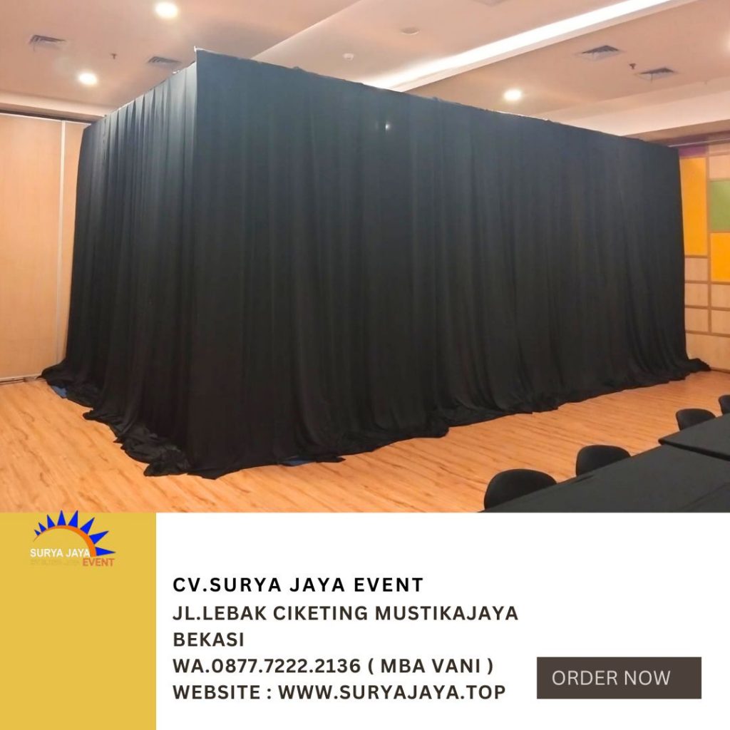 Tirai hitam ini pernah disewa untuk acara di The Margo Hotel pada tanggal 21 Agustus 2019,untuk tirai ini ukurannya 2×15 meter.