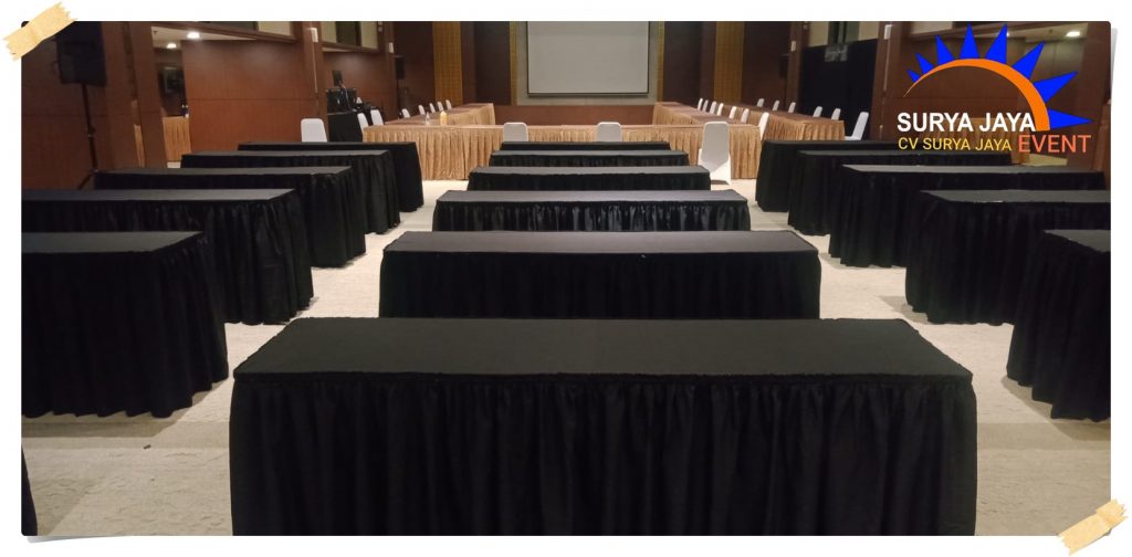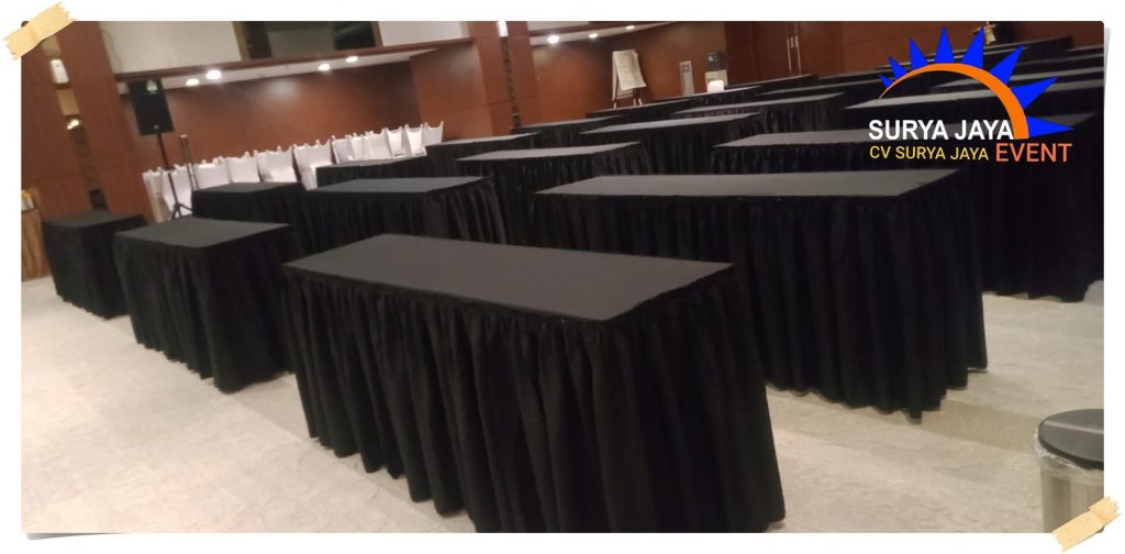 CV.Surya Jaya Event Rental Meja Ibm Cover Skirting Hitam.Meja ibm kami tersedia dua ukuran mulai dari meja ibm ukuran 180×45 cm dan meja ibm ukuran 180x45x75 cm.Meja ibm kami ada dua yaitu meja ibm multiflek dan meja ibm hpl.Untuk warna cover skirting tersedia banyak pilihan jadi anda bisa pilih sendiri sesuai keinginan.Kami siap menerima pemesanan dengan skala kecil maupun skala besar.Untuk kebutuhan kursi anda bisa rental kursi futura atau kursi dengan jenis lainnya yaitu : kursi direktur,kursi dealing,kursi vip kayu dll.