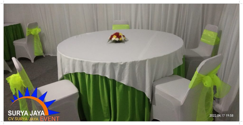 Sewa Meja kursi Free Ongkir Wilayah Jabodetabek dengan syarat dan ketentuan yang berlaku khusus pemesanan minimal order.Meja kursi yang kami sewa kan meja bulat cover hijau topping putih dan kursi futura dengan sarung kursi ketat putih aksesoris pita hijau.Meja bulat dan kursi futura terlihat sangat mewah dan menarik dengan cover meja dan sarung kursi yang kualitasnya sesuai standar hotel.Untuk cover meja bulat,topping meja,sarung kursi dan pita kursi tersedia banyak pilihan warna jadi anda bebas pilih sendiri sesuai keinginan atau bisa juga sesuai dengan tema acara anda.Untuk ukuran meja bulat ada tiga ukuran mulai dari meja bulat d:120 cm,meja bulat d:160 cm,meja bulat d:180 cm.Kami sediakan meja bulat dan kursi futura dengan jumlah ribuan unit.