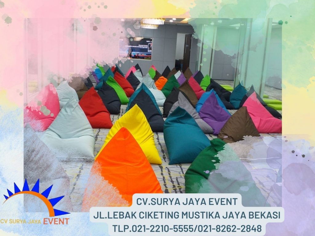 cv. surya jaya event menyewakan berbagai macam alat dan perlengkapan pesta salah satunya Menyewakan Bean bag EStetic Dan Berkualitas, banyak pilihan warna yang tersedia diantarnya ada warna pink, warna merah , warna biru, warna hijau, warna kuning, warna coklat, warna hitam, warna oren, warna abu-abu, warna ungu dan masih banyak lagi, tentunya binbag yang kami sewakan sangat nyaman dan empuk jika diduki dan tidak akan terasa sakit.