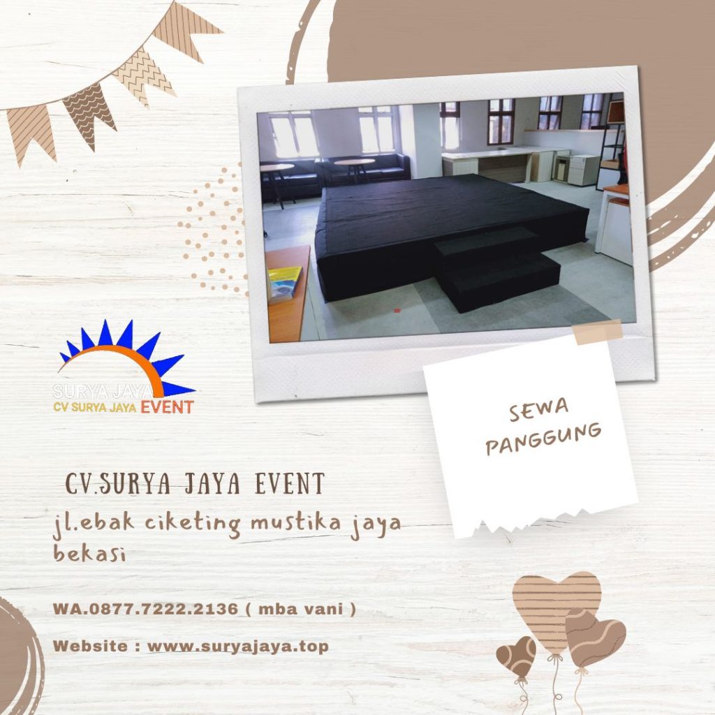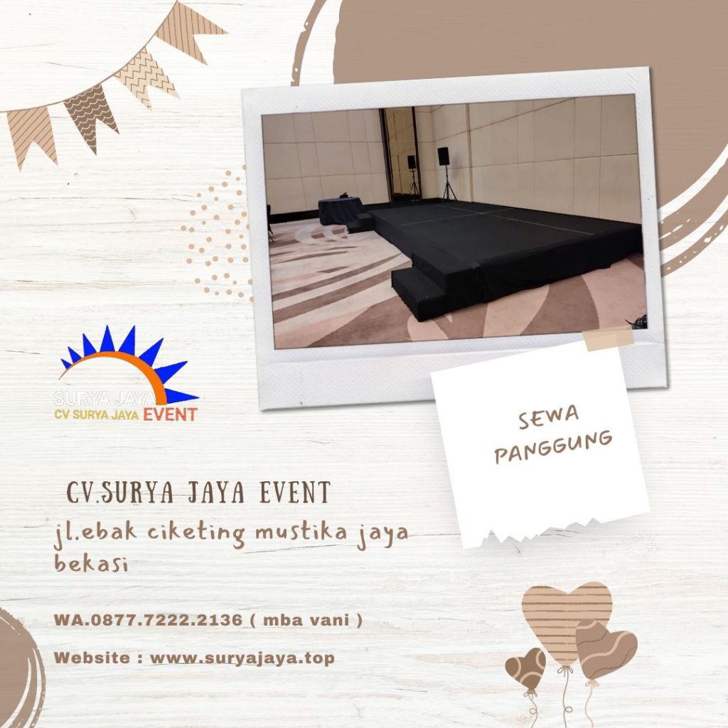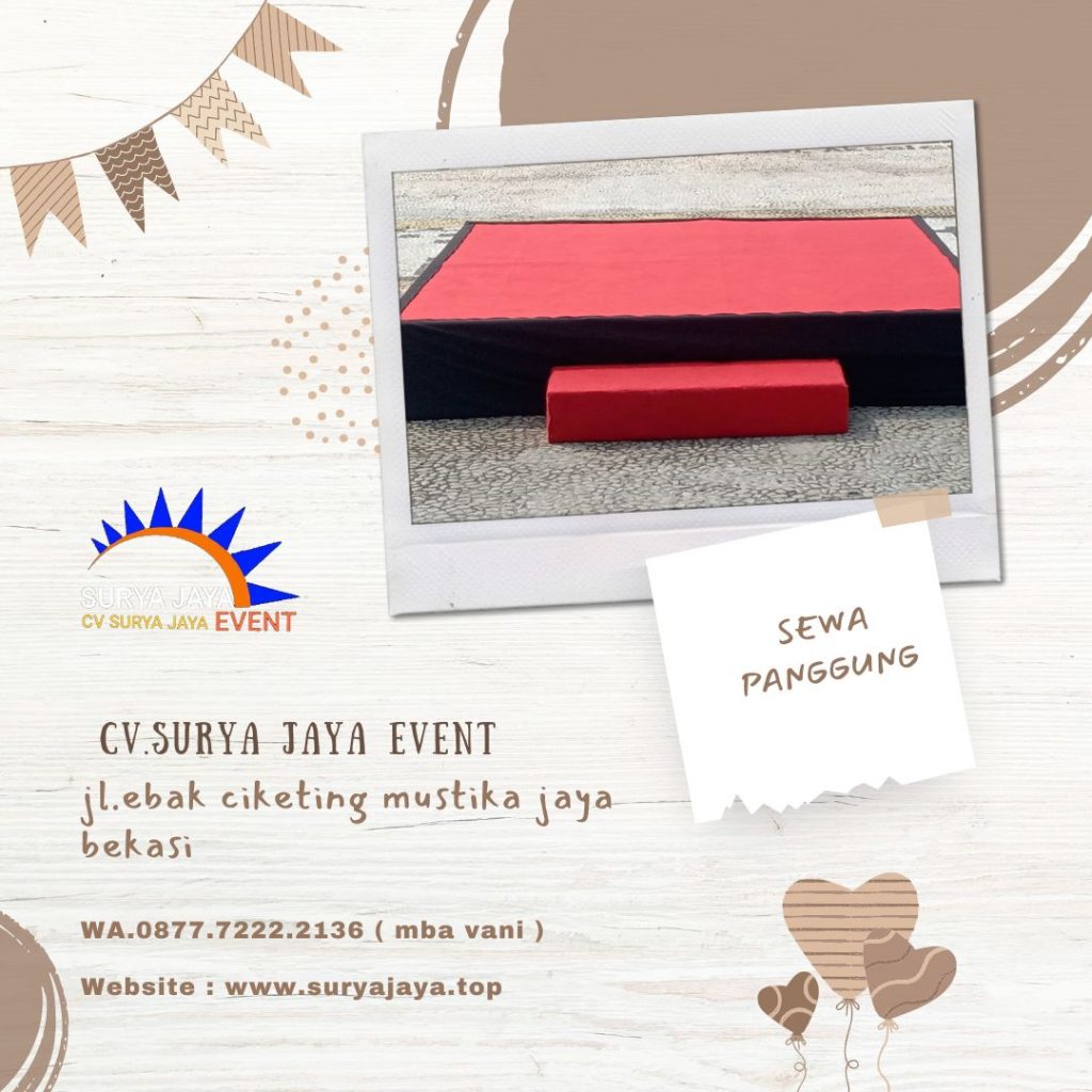 CV.SURYA JAYA EVENT Sewa Panggung Cempaka Putih Timur Cempaka Putih Jakarta Pusat siap bongkar pasang daerah jabodetabek dan sekitarnya.Panggung yang kami sewakan ini adalah Sewa Panggung Portable.Panggung portable dilengkap dengan karpet yang kualitasnya bagus sehingga panggung tampil cantik,menarik dan rapi.Untuk warna karpet tersedia banyak pilihan warna jadi bisa pilih sendiri sesuai permintaan.Untuk pemasangan dijamin rapi karena pemasangan oleh tenaga ahli yang berpengalaman.Untuk ukuran tinggi panggung mulai dari 20 cm sampai 60 cm.Panggung bisa digunakan untuk acara indoor maupun acara outdoor.Panggung biasanya dipakai untuk seminar,acara launching produk,acara peresmian dan bisa juga buat acara-acara lainnya.Panggung juga bisa dilengkapi dengan backdrop dan mini garden sehingga mewah, cantik dan menarik juga berkesan.