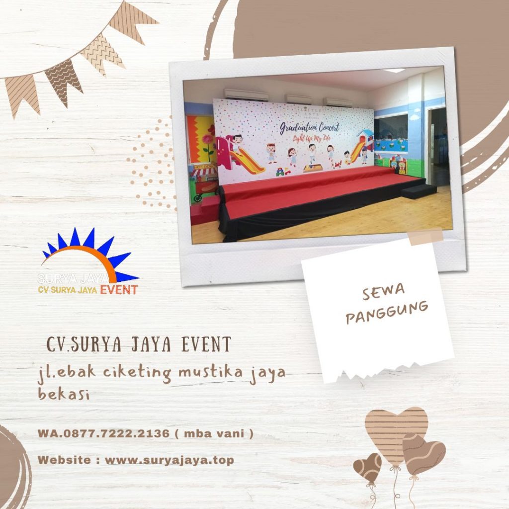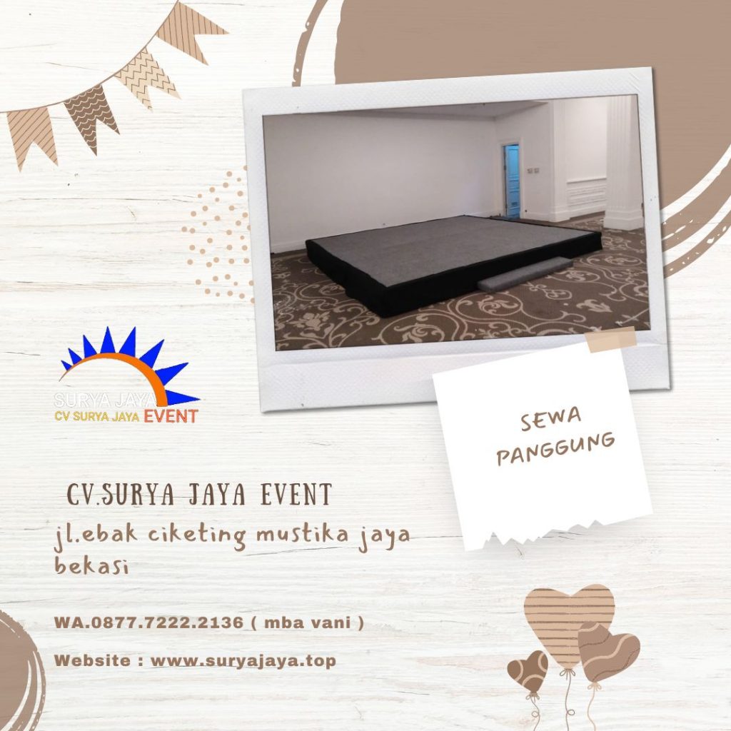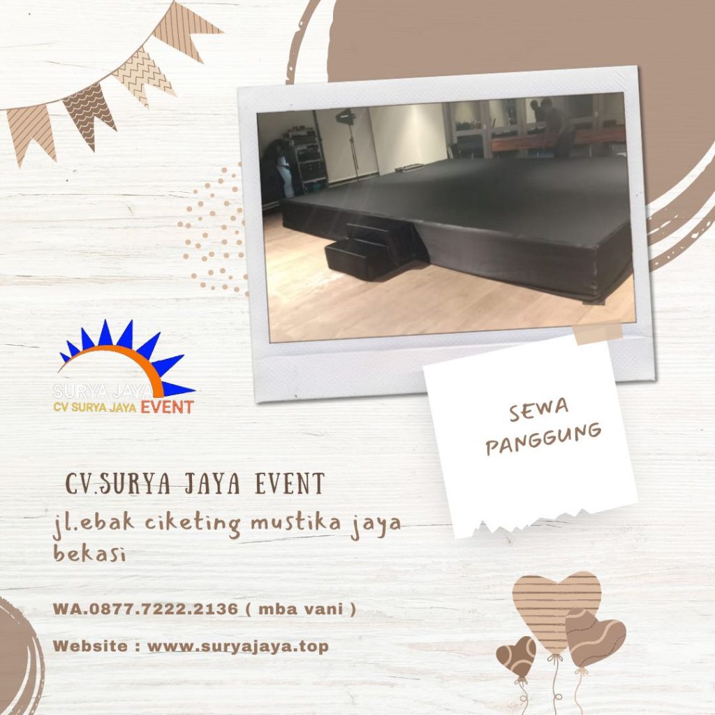 CV.SURYA JAYA EVENT Sewa Panggung Cempaka Putih Timur Cempaka Putih Jakarta Pusat siap bongkar pasang daerah jabodetabek dan sekitarnya.Panggung yang kami sewakan ini adalah Sewa Panggung Portable.Panggung portable dilengkap dengan karpet yang kualitasnya bagus sehingga panggung tampil cantik,menarik dan rapi.Untuk warna karpet tersedia banyak pilihan warna jadi bisa pilih sendiri sesuai permintaan.Untuk pemasangan dijamin rapi karena pemasangan oleh tenaga ahli yang berpengalaman.Untuk ukuran tinggi panggung mulai dari 20 cm sampai 60 cm.Panggung bisa digunakan untuk acara indoor maupun acara outdoor.Panggung biasanya dipakai untuk seminar,acara launching produk,acara peresmian dan bisa juga buat acara-acara lainnya.Panggung juga bisa dilengkapi dengan backdrop dan mini garden sehingga mewah, cantik dan menarik juga berkesan.