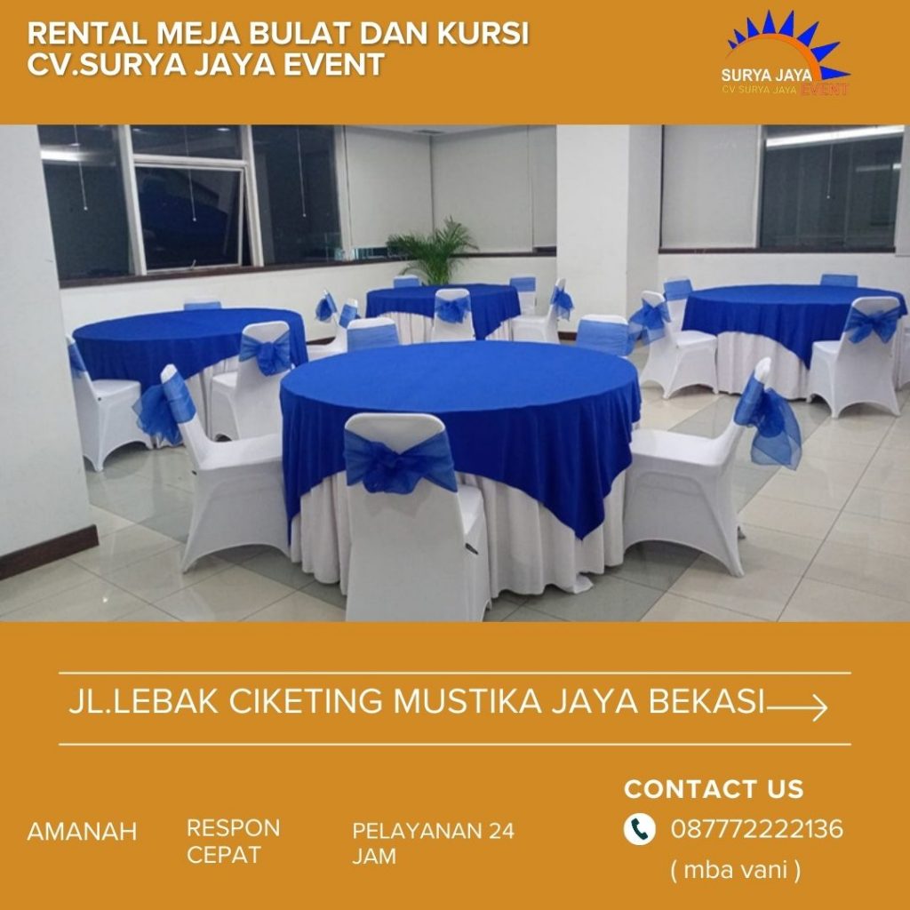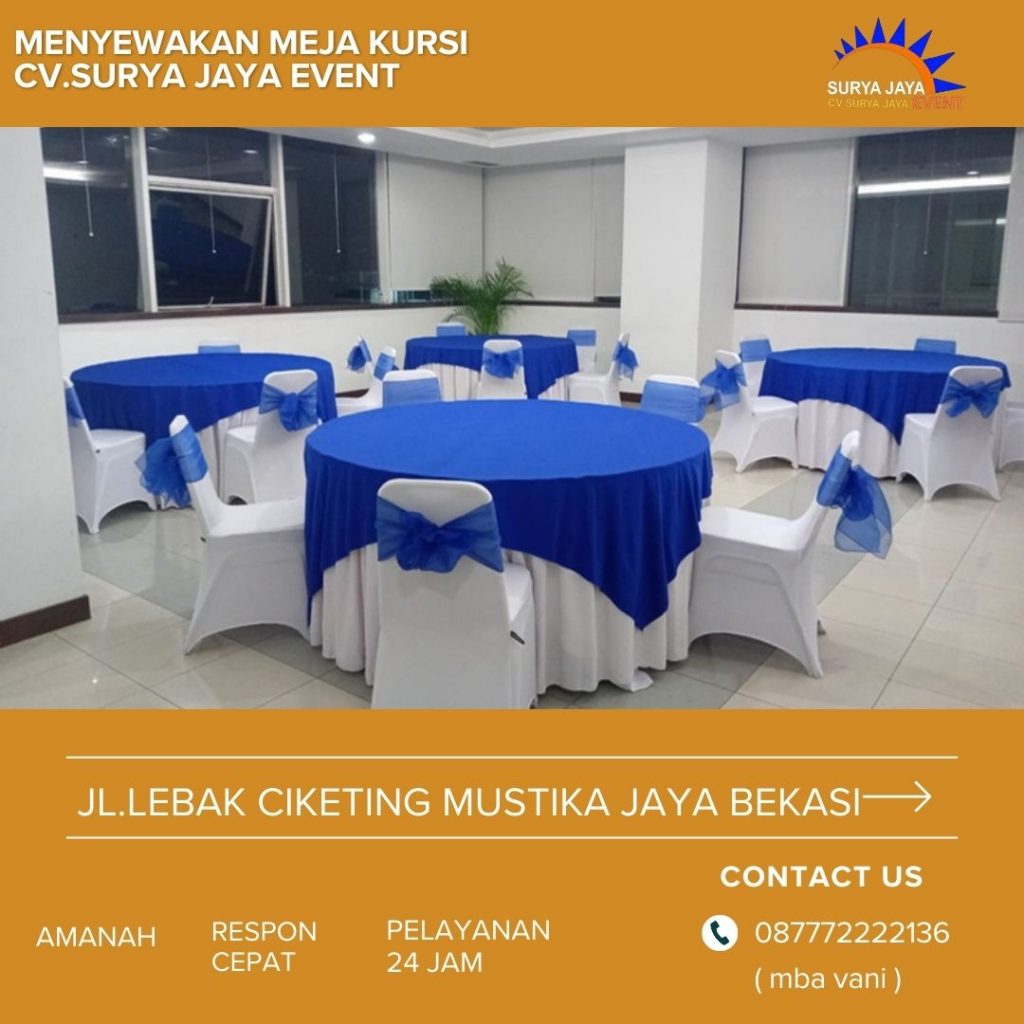 Harga Promo 2024 Sewa Meja Kursi Jakarta murah kualitas standar hotel siap kirim dan langsung setting di tempat.Meja kursi yang kami sewakan tentunya kualitas standar hotel dan harga sewanya juga murah terjangkau.Bagi anda yang ingin menyewa meja kursi buat acara,ayo sewa pada kami saja!!! kami akan memberikan yang terbaik untuk kepuasan anda.Untuk pemesanan bisa langsung hubungi kami di nomor 087772222136 ( mba vani ) atau bisa juga datang ke gudang kami.Kami akan melayani anda dengan layanan terbaik.