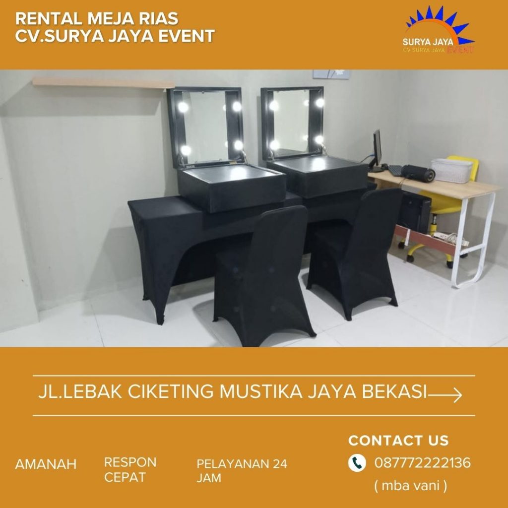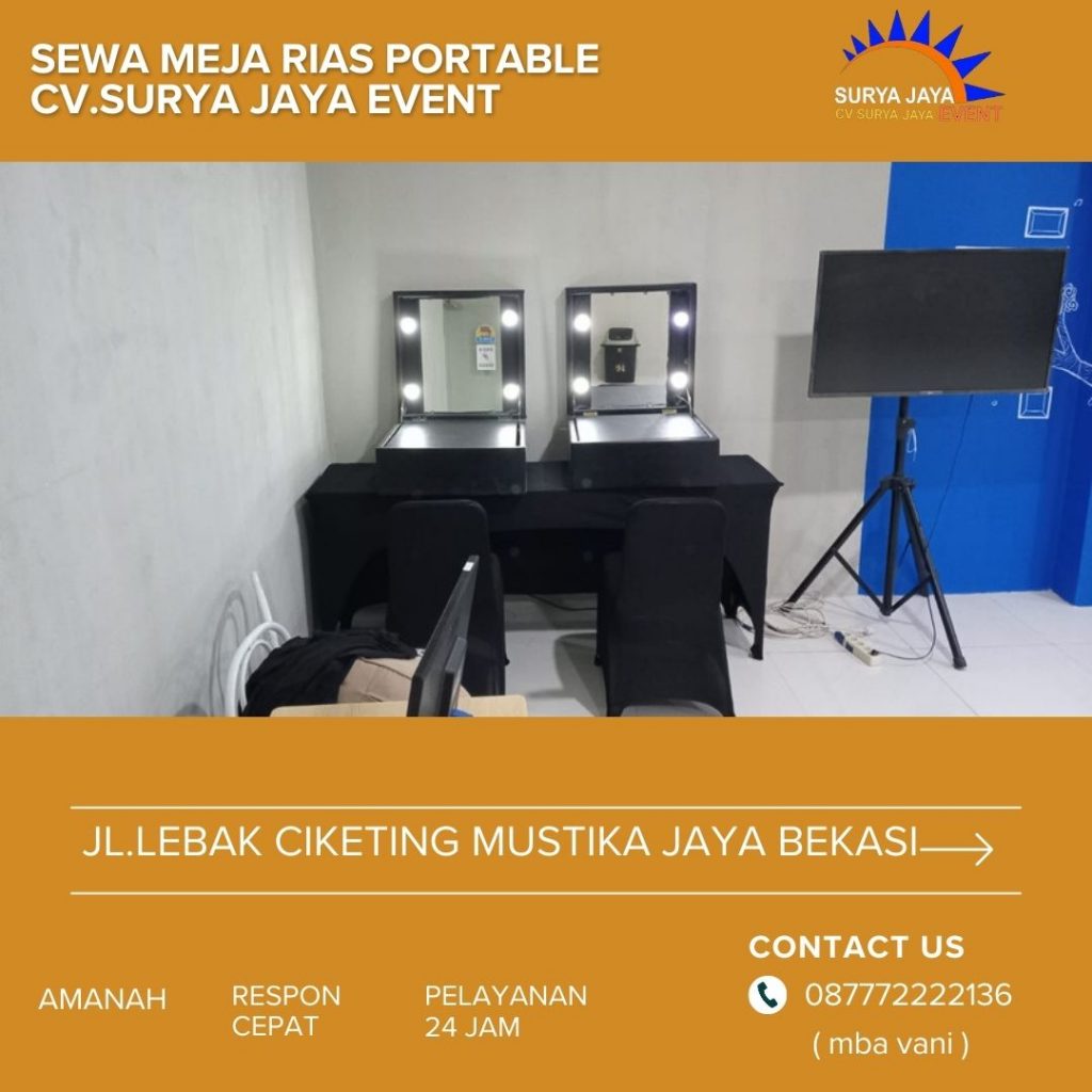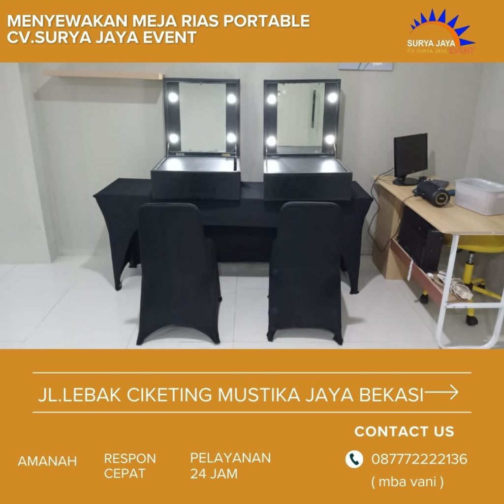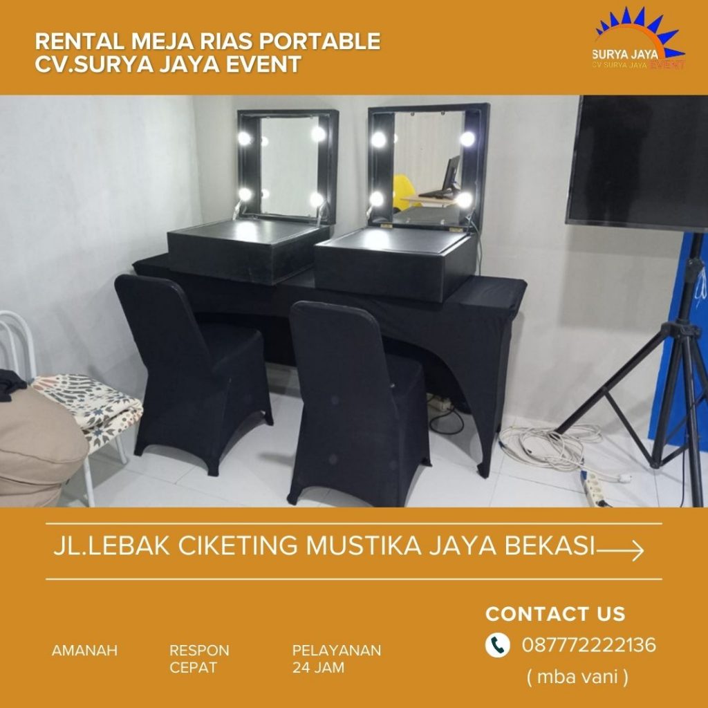 CV.SURYA JAYA EVENT Menyewakan Meja Rias Jakarta Harga Terbaru 2024 kualitas bagus,dilengkapi dengan kaca rias,lampu penerangan,meja kotak hitam untuk tempat make up dan kosmetik.Meja rias yang kami sewakan ini meja rias modern yang disebut dengan meja rias portable.Meja rias bisa digunakan untuk acara pernikahan,acara lomba rias,acara fashion show dan bisa juga buat acara-acara lain sebagainya.Meja rias punya kami selalu bersih dan terawat siap disewakan kapan saja baik dalam jumlah besar maupun jumlah kecil.