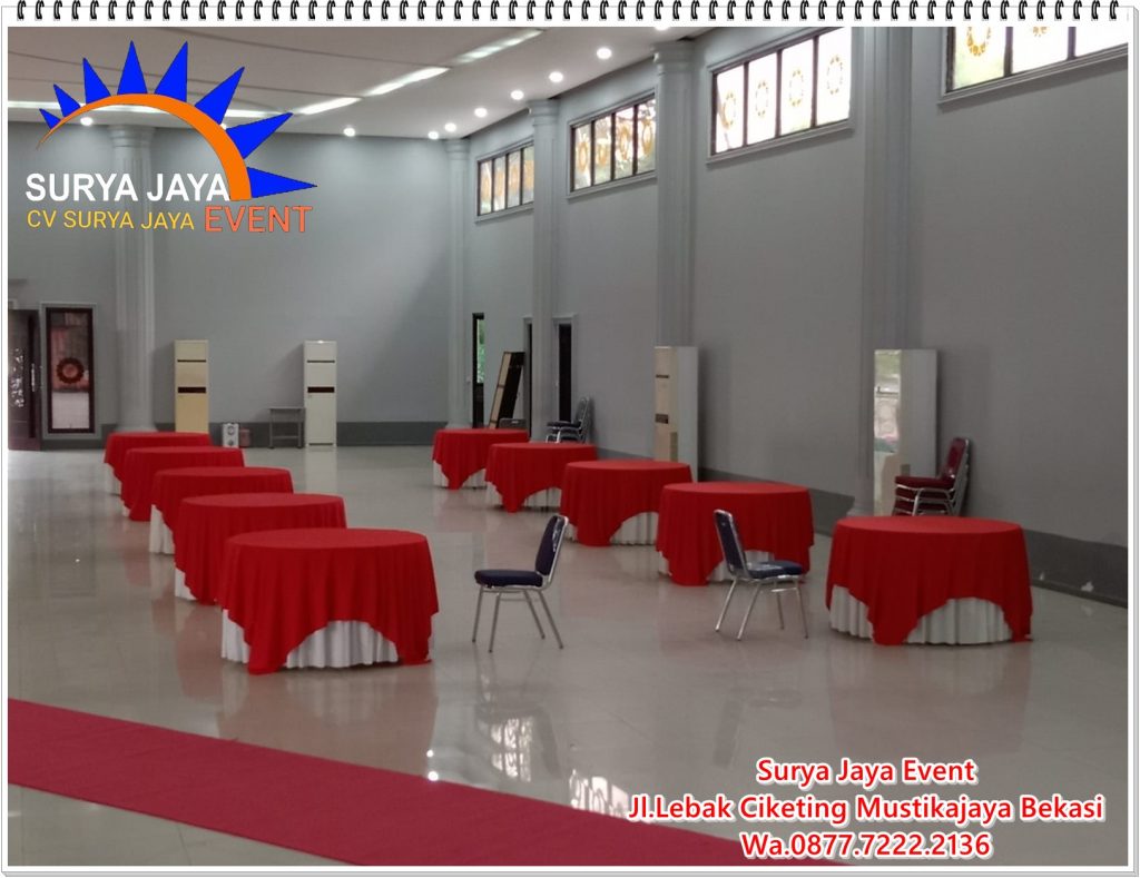 CV.Surya Jaya Event sedia jasa Sewa Perlangkapan Alat Pesta Jakarta Murah Dan Berkualitas.Dan kami siap mengirim pesanan sampai tujuan.Untuk pengiriman gratis ongkir dengan syarat dan ketentuan yang berlaku.Perlengkapan alat pesta yang kami sewakan adalah meja bundar dan kursi futura.Meja bundar kami tersedia beberapa ukuran mulai dari meja bundar ukuran d:120 cm,meja bundar ukuran d:160 cm,meja bundar ukuran d:180 cm.Silahkan pilih sendiri untuk ukuran meja bundar sesuai permintaan dan kebutuhan.Meja bundar kami dilengkapi dengan cover standar hotel.Kursi futura juga dilengkapi dengan sarung kursi dan pita.Jadi meja bundar dan kursi futura tampil mewah,menarik juga berkelas.Untuk warna cover meja bulat dan sarung kursi futura tersedia banyak pilihan jadi boleh pilih sendiri sesuai permintaan.