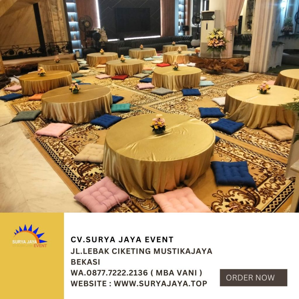 CV.SURYA JAYA EVENT Sewa Meja Lesehan Bundar Taplak Gold Dan Bantal Lesehan Jakarta layanan siap antar jemput. Meja lesehan bundar memang tampil cantik,rapi,menarik,mewah dengan dilengkapi taplak meja karena taplak meja mempunyai kualitas standar hotel. Dijamin taplak meja bersih,wangi,tidak lecek,tidak lusuh,tidak robek. Untuk warna taplak meja tersedia banyak pilihan jadi customer boleh memilih sendiri sesuai keinginan atau sesuai tema acara. Ukuran meja lesehan bundar ada yang ukuran d120cm dan ukuran d160cm. Bantal lesehannya dijamin empuk dan aman.