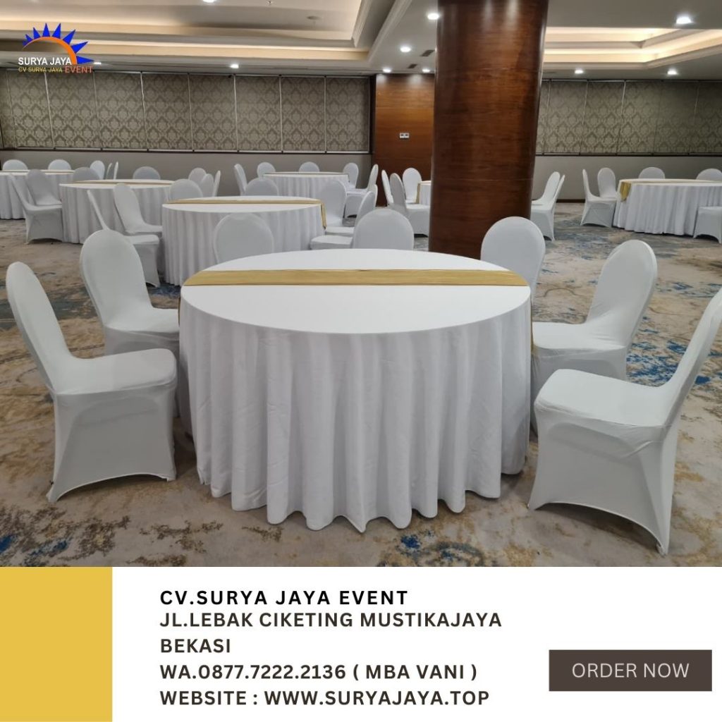 Butuh meja bundar untuk event ??? Ayo sewa di CV SURYA JAYA EVENT yang merupakan Pusat Sewa Meja Bundar Cover Tebar Putih Runner Gold Di Jakarta. Ukuran meja bundar boleh request,warna cover dan runner juga boleh pilih sendiri sesuai keinginan. Untuk ukuran meja bundar ada beberapa pilihan mulai dari meja bundar d75cm,meja bundar d90cm,meja bundar d120cm,meja bundar d160cm,meja bundar d180cm,meja bundar d220cm. Jadi silahkan pilih meja bundarnya sesuai keinginan. Untuk kebutuhan kursi disini anda juga bisa sewa di tempat kami.